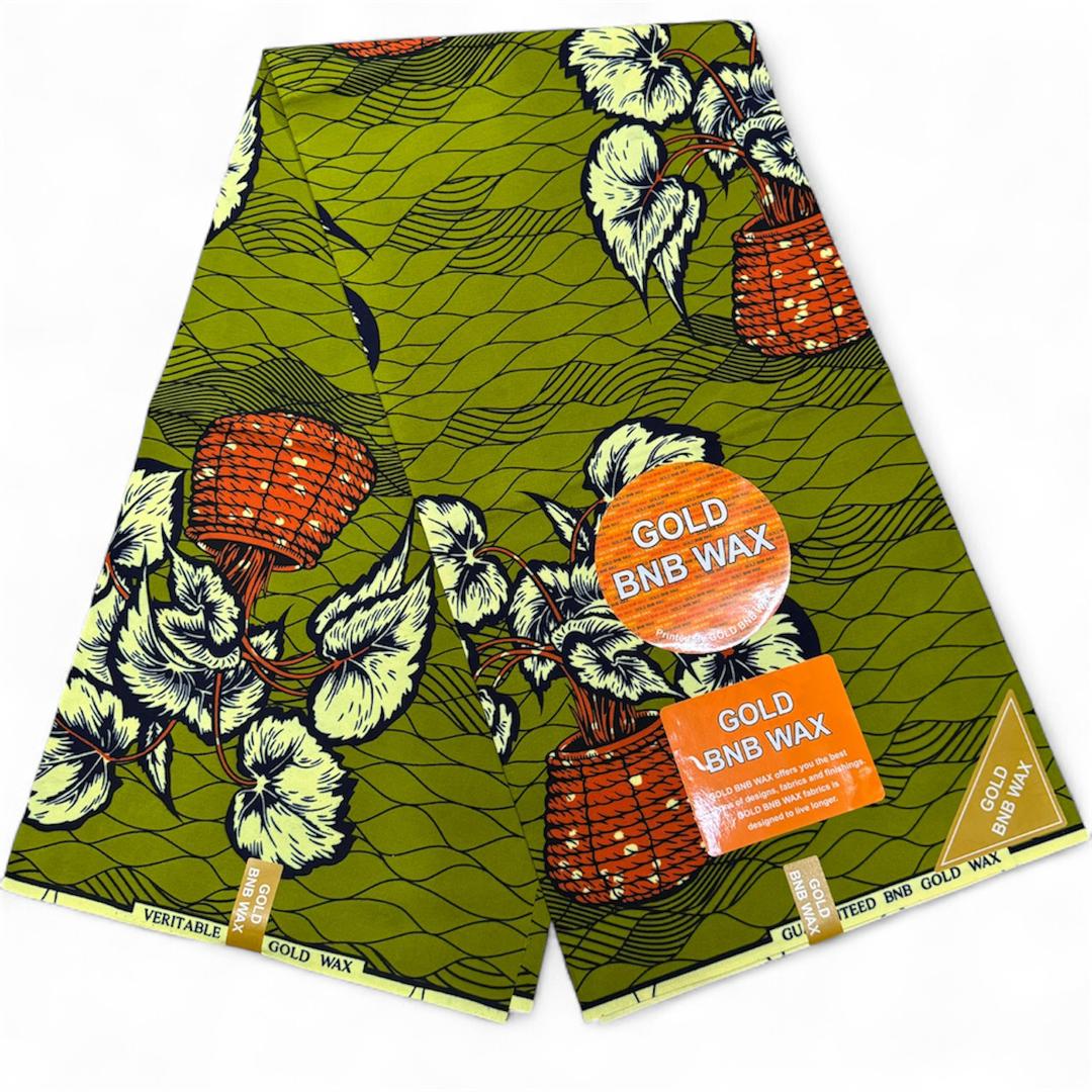 Élégant pagne wax Gold BNB au fond vert olive, orné de paniers fleuris aux détails raffinés. Tissu wax de qualité premium, couleurs durables et impression nette. Idéal pour robes, ensembles, boubous et tenues chics pour toutes occasions.