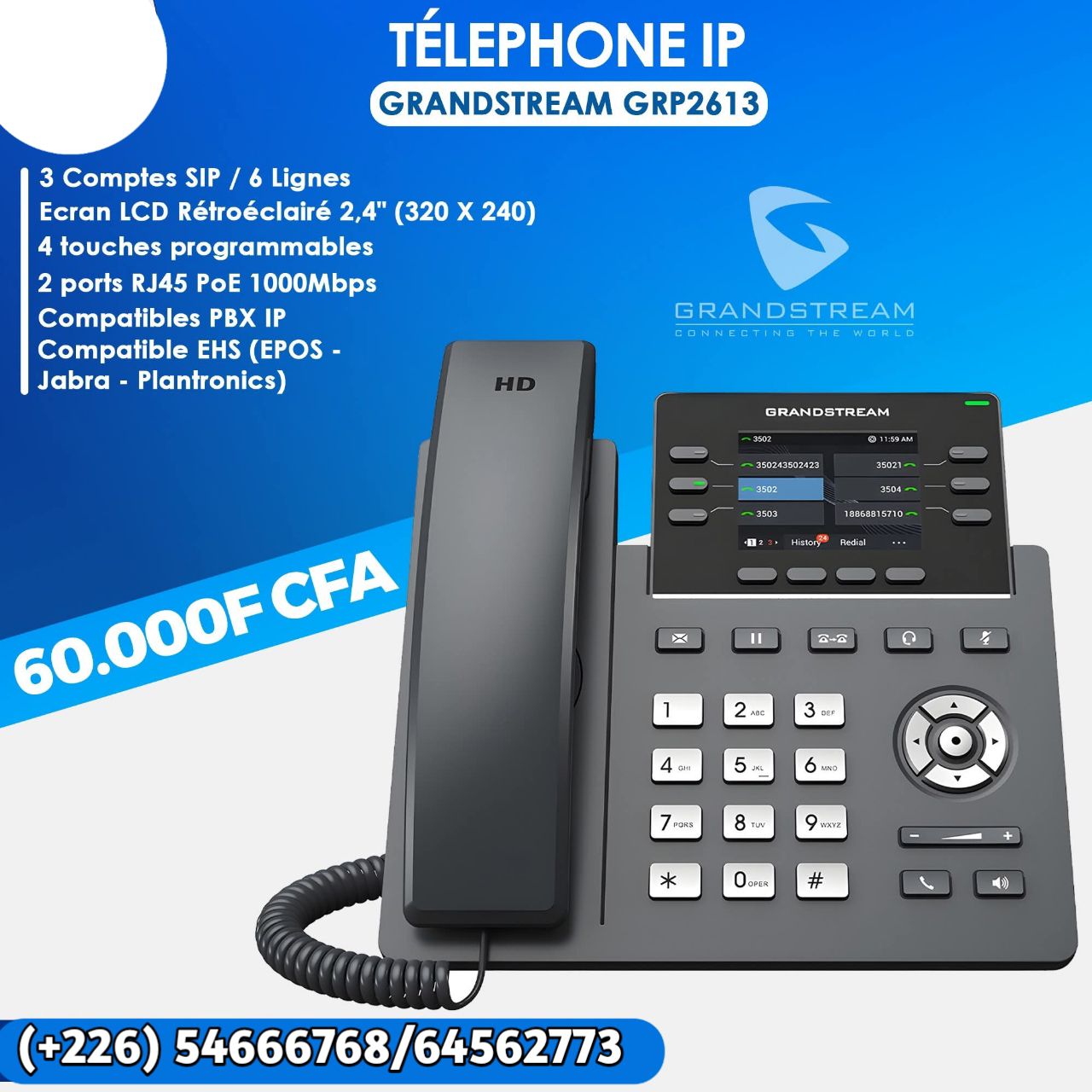 Le Grandstream GRP 2613 est conçu pour un usage « carrier-grade » ou pour les entreprises avec des besoins de déploiement importants (salles, open-spaces, hot-desking). Il propose :